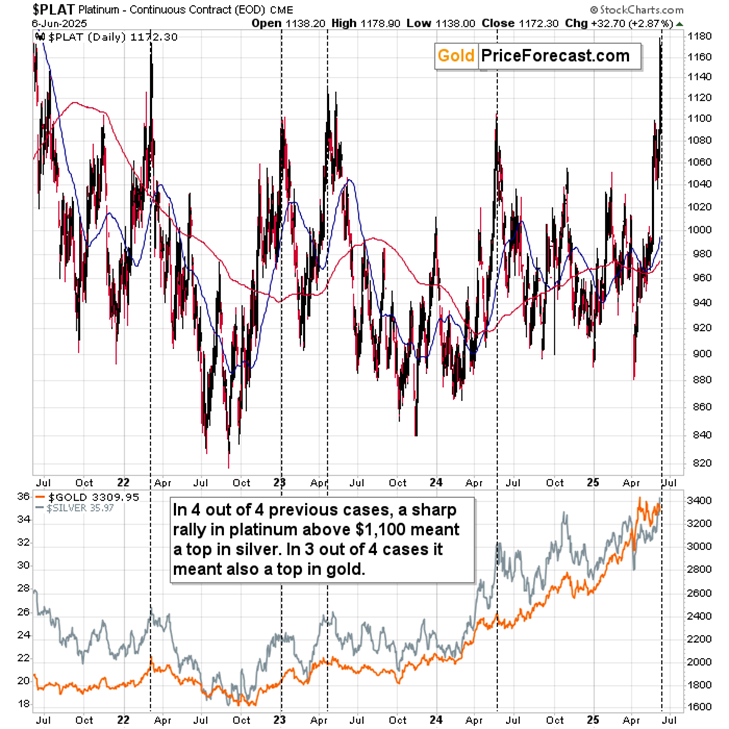 Many things change on the markets and in methodologies, but one thing remains intact – whenever something “feels” super urgent or when it looks like the train is leaving the station and you just have to react, it’s usually good not to react, but to respond – meaning to take action (or not to take it) after taking some time to consider what’s going on and what happened on previous occasions when we saw the same thing on a given market. The current rally in platinum is no exception from this rule.