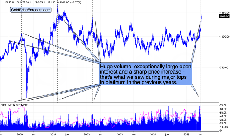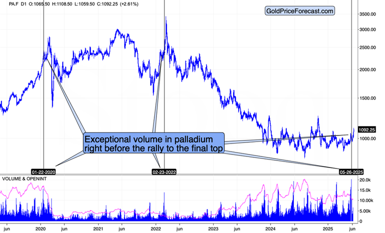 The early-2020 spike in volume and the 2022 spike in volume were both followed by the rallies to final tops. And it’s not now that we see the volume spike in palladium – we already saw it some time ago, further confirming the case that THIS is the final rally before the slide.