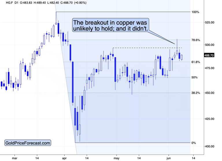 The fundamental (tariffs and their implications on world trade) and medium-term technical outlooks for copper are terrible. And yet, copper futures just (yesterday) soared above the 500 level. The move was invalidated on the same day right after copper futures touched the 78.6% Fibonacci retracement, and now copper is back below its late-April high.