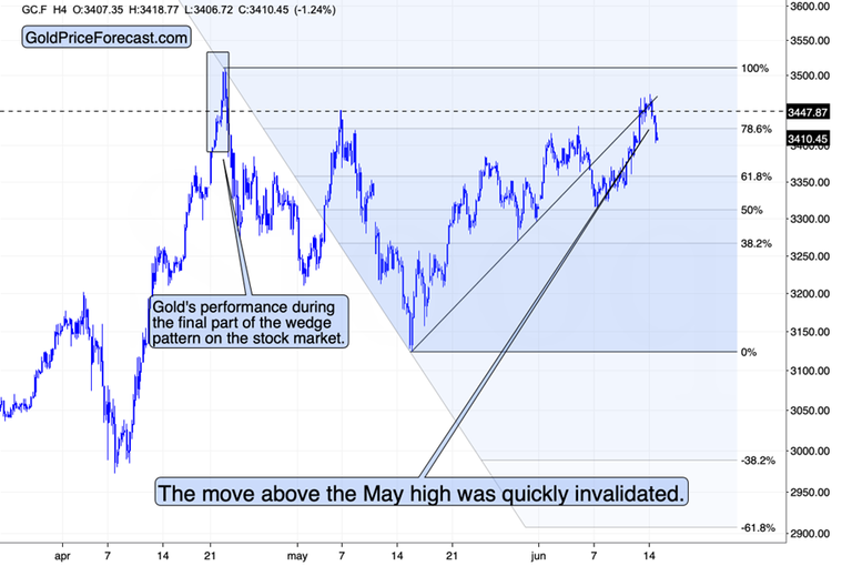 Essentially, it’s the same thing. Based on a breakout, the price is “supposed to” rally. If it doesn’t and it declines instead, it serves as a sell signal. Right now, gold is “supposed to” rally based on increased geopolitical tensions, but this is not taking place, and it also serves as a sell signal.