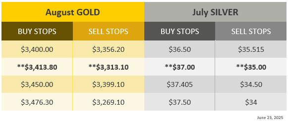 Below are today’s likely price locations of buy and sell stop orders for the active Comex gold and silver futures markets. The asterisks (**) denote the most critical stop order placement level of the day (or likely where the heaviest concentration of stop orders is placed on this day).