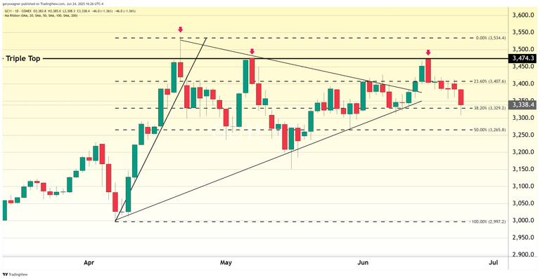 As of 3:47 PM ET, gold futures had declined $57.70, or 1.70%, to $3,336.50, representing a complete unwinding of the conflict-driven premium that had accumulated over the past two weeks.