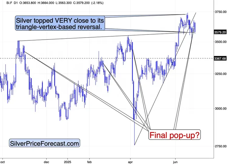The monthly decline is not huge, but if June ended right now (and we still have two June sessions ahead of us), it would be the first month where gold declined in 2025. Gold was rallying strongly until April, and then the rally appears to have ended.
