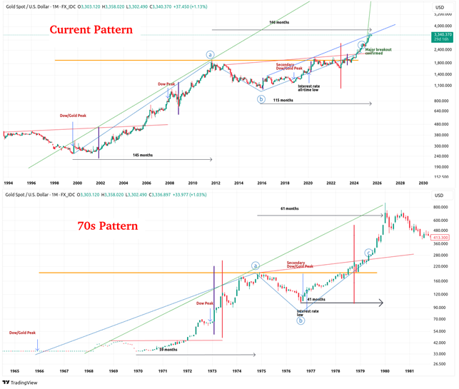 I have marked out two patterns (current and 70s patterns) that show how the recent breakout puts gold in the acceleration phase of the bull market.