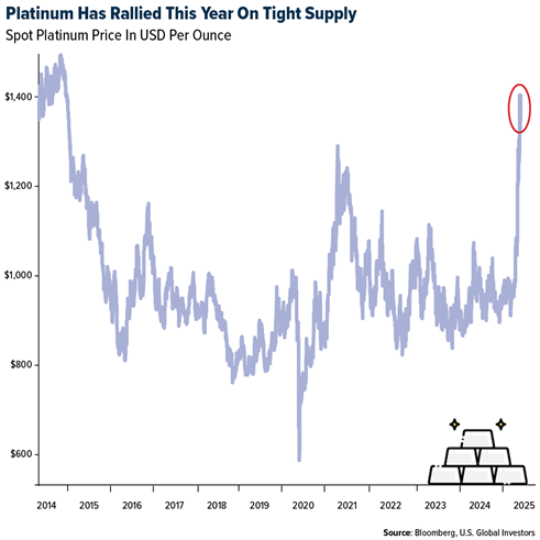 - Precious metals refiner Heraeus notes that “supply slipped to start the year.” Tightness in platinum supply may have driven the price breakout above $1,150/ounce, but easing pressure on the supply side is likely why platinum prices are forecast to trend lower in H2 2025.
