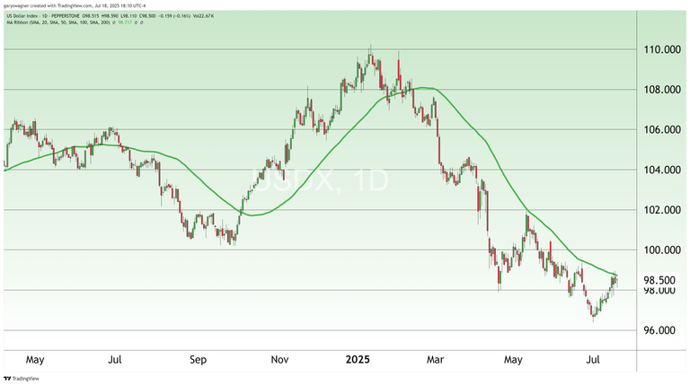 The dollar index advanced 0.88% during the week of July 7, reaching 97.863, followed by an additional 0.65% gain this week to 98.50. This sustained dollar strength has weighed on gold, which typically moves inversely to the U.S. currency.