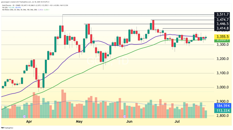 As of 5:07 PM ET, the most active August gold futures contract traded at $3,356, reflecting today's gain of $10.06 or 0.32%. The daily advance was supported by modest weakness in the dollar, which declined 0.16% to 98.50. Despite today's uptick, gold futures have surrendered $14.80 or 0.44% for the week.
