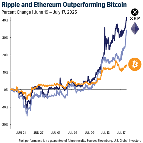 - Tokens perceived to benefit from regulatory changes and increased tokenization of financial assets, including Ethereum and Ripple, have outperformed lately, indicating traders may be rotating holdings more than taking directions bets on the space, writes Bloomberg.