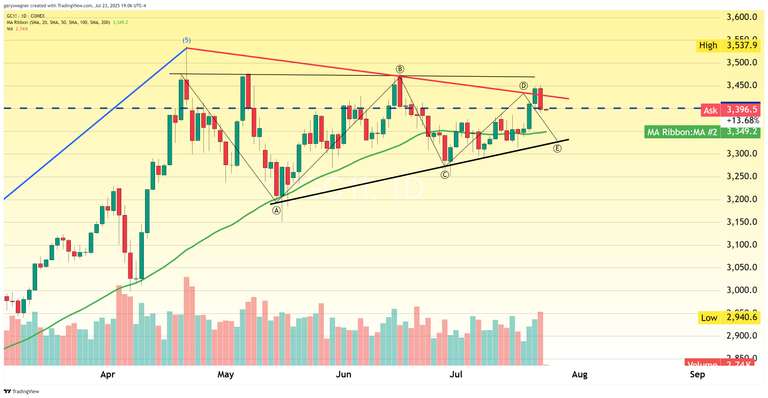 The decline in safe-haven demand prompted gold to surrender all of yesterday's gains while extending losses further. As of 5:00 PM ET, gold futures were trading down $43.50, or 1.26%, at $3,400.20. This decline pushed prices below the significant 23% Fibonacci retracement level at approximately $3,410, calculated from the April 7th low near $3,000 to the all-time intraday high above $3,500.