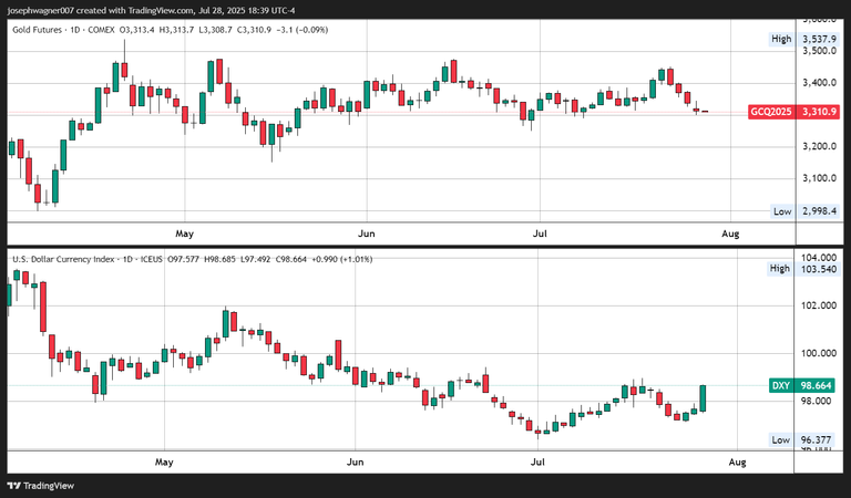 Despite the dollar's pronounced strength, gold demonstrated some underlying resilience. While gold futures declined $24.50 to close at $3,314, representing a 0.73% decrease, this decline was notably modest relative to the dollar's appreciation of over one percent. This divergence suggests the presence of strategic buyers willing to accumulate gold positions despite the challenging technical environment created by dollar strength.