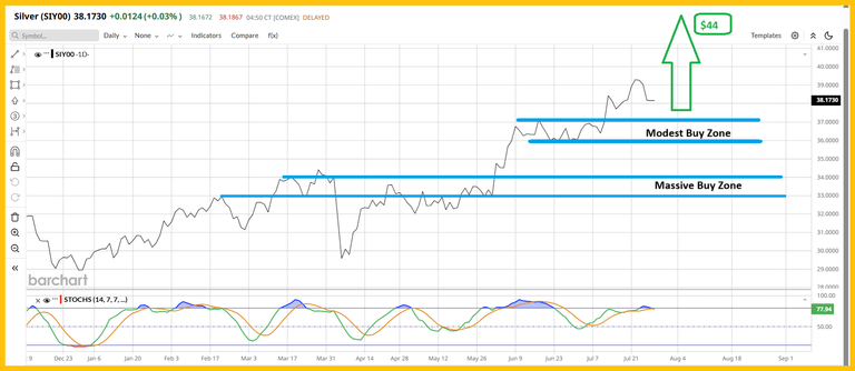 Investors need to focus on getting more gold and excitingly, silver and mining stocks are two of the best ways to do that. For a look at silver. Silver seems “eager” to surge towards $44. This week’s slew of reports may give investors a final chance to get in at $37 or even $36… before the big rally begins.