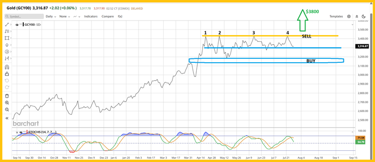 The $3800 target zone is the same as for the daily chart, and the inverse H&S pattern on the Stochastics oscillator (14,5,5 series) is “bullishly intriguing”.