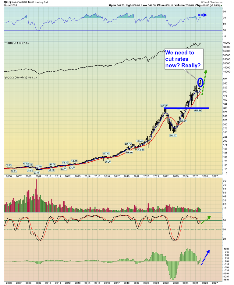Double-click to enlarge this QQQ Nasdaq ETF chart. The Fed is going to be reluctant to cut rates with the stock market soaring.
