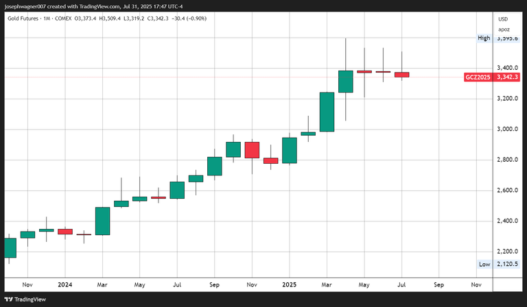 July's conclusion allows for a comprehensive assessment of gold's recent trajectory, and the picture is one of remarkable stagnation despite headline-grabbing record highs. Over the past three months, from April's close to current levels, gold futures have declined approximately $40, representing a 1.21% loss. This sideways action is perhaps best illustrated by the formation of three consecutive monthly doji candlesticks, indicating that each month's close approximated its opening level.