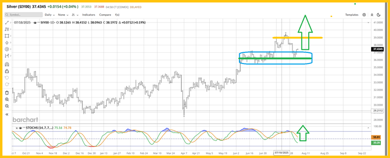 - A (14,7,7 series) Stochastics buy signal is coming into play and enough time has passed during the formation of the rectangular drift between $3200 and $3440 to reasonably assume that a major upside breakout is imminent.