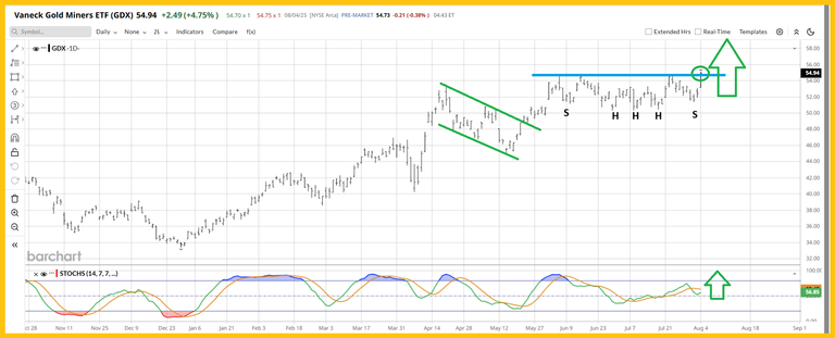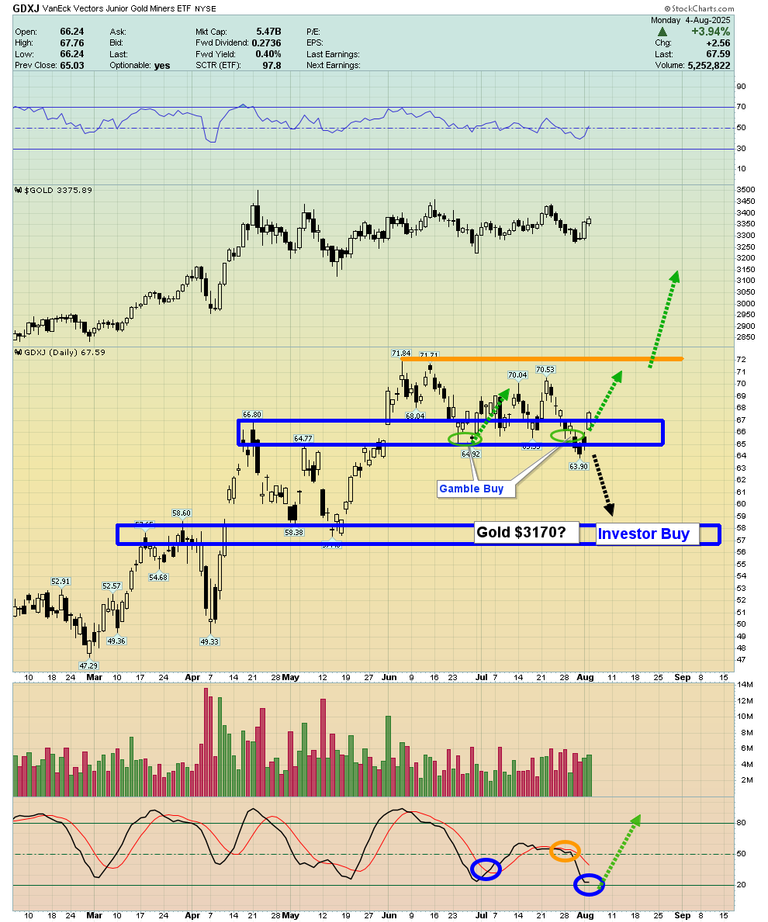 Double-click to enlarge this GDXJ junior miners ETF chart. Note the fantastic position of the (14,7,7 series) Stochastics oscillator at the bottom of the chart.