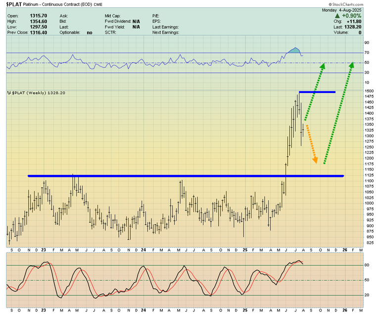 What about palladium’s sister metal, platinum? A pullback to the deep value zone near $1100 is much less likely for platinum than palladium and a move over the $1500 area highs could ignite another big surge towards $1800-$2200.
