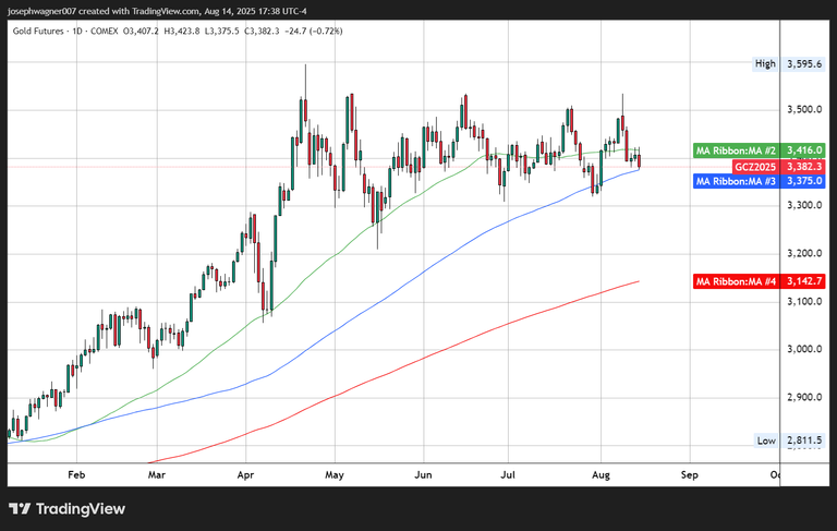 The precious metals complex bore the brunt of the market's reassessment following the PPI release. Gold futures experienced a sharp $30 decline in the four hours immediately following the data, reaching an intraday low of $3,375.50 before recovering modestly to settle at $3,382.30. This selloff represented the second consecutive failure for gold futures to establish a foothold above the critical 50-day simple moving average, currently positioned at $3,416.
