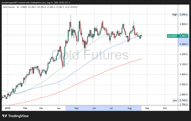 The real reason for a September cut is no longer seen as a given has to do with the info revealed in the July Minutes in Which only two members voted to cut rates in September. For that reason, gold will continue to face an uphill battle no matter what is said Tomorrow. This can be seen on gold’s daily chart showing 6 of the last 9 trading sessions resulted in gold closing lower. Over the past 10 day’s gold futures have given up over $100 of value and where last seen at $3,384.50.