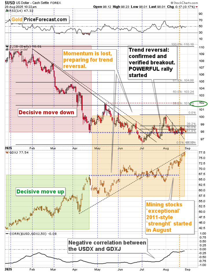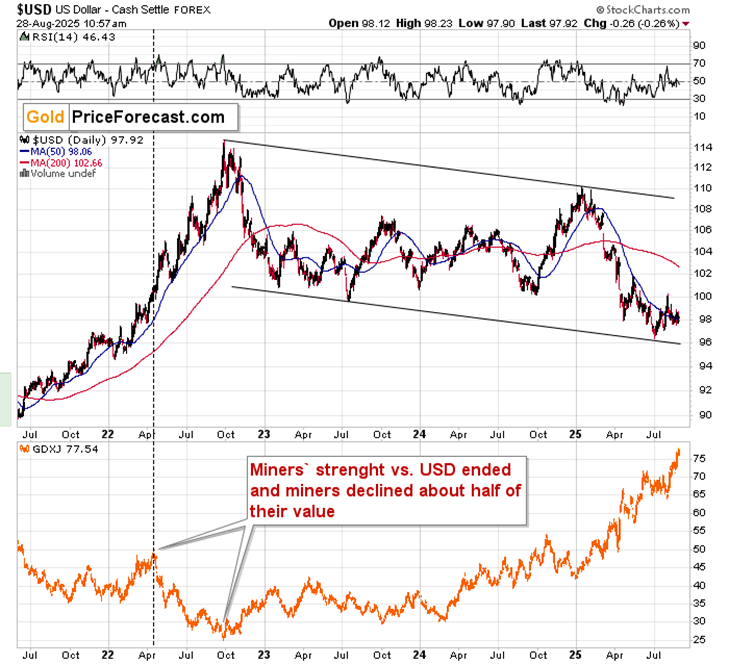 That’s when miners stopped being strong relative to what was going on in the USD Index and they gave up. Literally – miners gave up 50% of their value in the following months.
