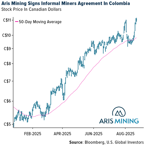 - Aris Mining has partnered with 2,500 small-scale miners, who now produce 45% of output from its Segovia mine in Colombia. Instead of evicting them, Aris provides support and buys their gold—offering a more cooperative model than other miners in the region.