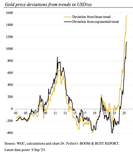 And it is the shift to a “new valuation regime” that may explain why the short-term price trend for gold has become so steep over the past two years, leading to a significant deviation from its long-term trend. This surge may not be an “exaggeration” destined to reverse but rather a permanent adjustment.