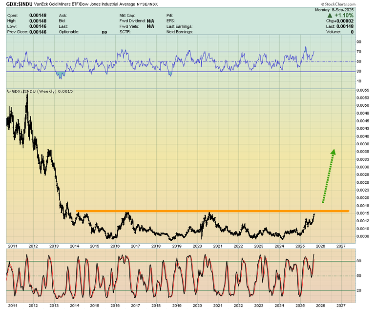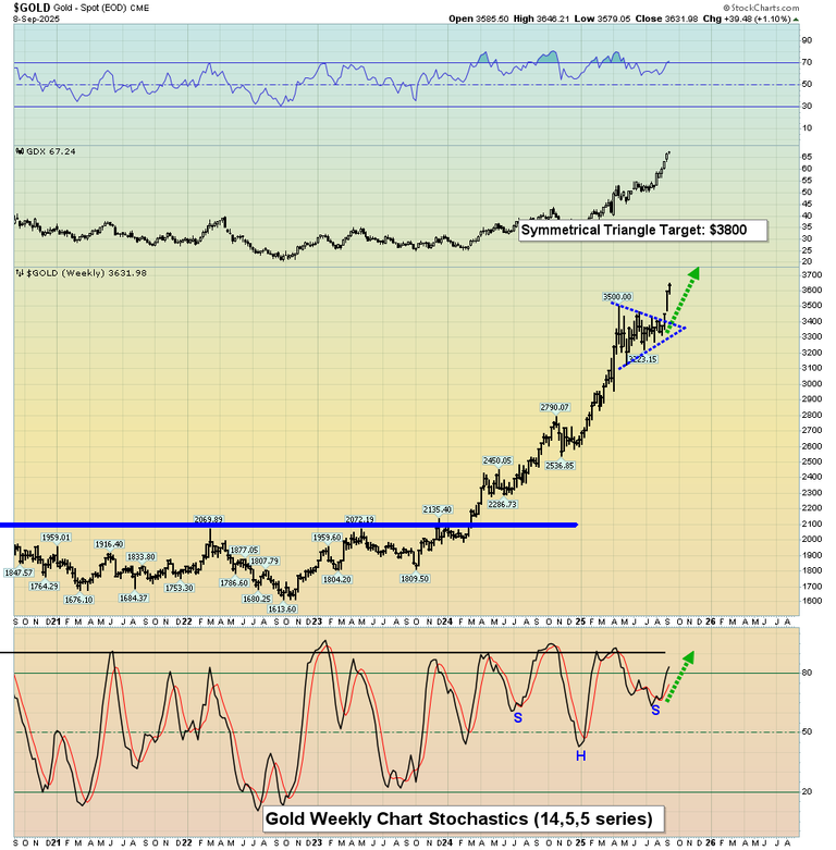 3. Here’s another spectacular weekly chart. I’ve been urging gold bugs around the world to respect the fabulous inverse H&S pattern on my 14,5,5 Stochastics oscillator.