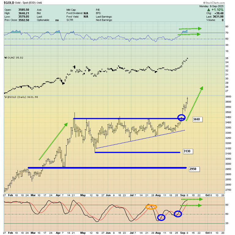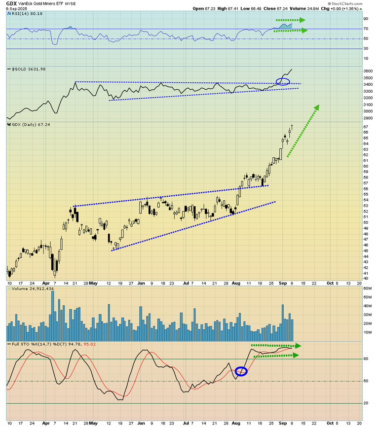 1. Basis GDX, gold stocks hit an all-time high yesterday… and gold is powering up the charts again today!