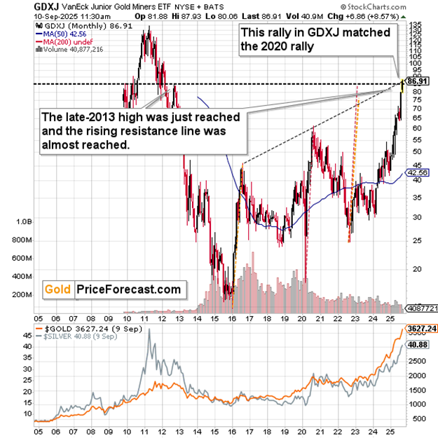 (…) it seems that the GDXJ has reached its own ‘this is it’ moment as its rally matched the size of the previously huge upswings. At the same time, it approximately reached long-term resistance levels. Plus, it’s extremely overbought on a short-term basis and it’s still early after U.S. Labor Day – it’s time for a decline.