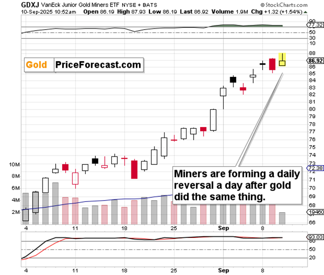 In response to that, miners declined yesterday, and today, they moved higher and reversed their course. It seems that they are forming a daily reversal one day after gold did the same thing.