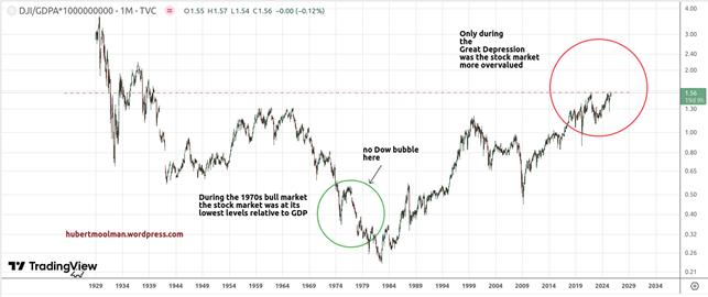 Currently, the stock market is definitely in bubble territory. Only during the Great Depression was the stock market more overvalued based on GDP.