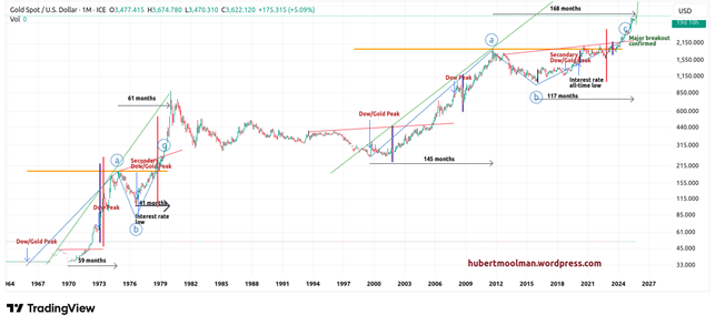 The structure of the 1970s pattern was such that after the bottom (point b) during the cup phase, price moved relatively slowly up at first, but once it broke out at the red line it moved up quite fast. Even current geopolitical risks (as they relate to the US dollar) suggest that this is plausible.