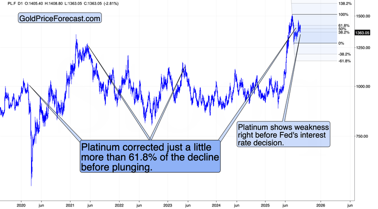 Platinum is down significantly as well. Platinum’s final attempt to rally back above the 61.8% Fibonacci retracement level failed and this might have marked the start of platinum’s big decline. Just like it’s been the case in the past.