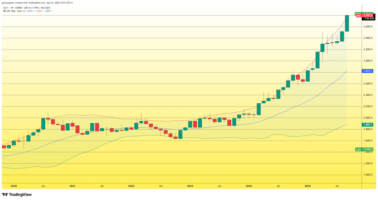The monthly performance for gold has been particularly noteworthy, with futures advancing 8% or $280 in September alone. This substantial gain ranks as the second-largest monthly increase in dollars ever, trailing only March's exceptional $290 advance. With several trading days remaining in September, gold futures are positioned to potentially challenge March's record for the largest monthly dollar gain on record.