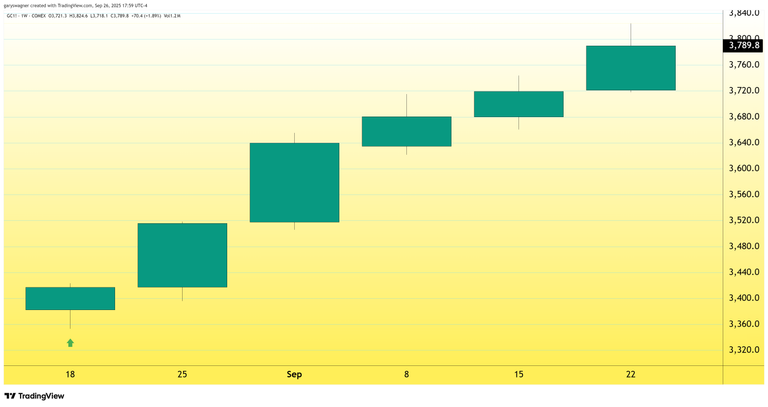 The rally's peak weekly performance occurred during September 2, when gold posted its strongest gain of 3.52% ($123.70), pushing prices to $3,639.80 per ounce. Since then, gold has maintained steady upward momentum with consecutive weekly advances of 1.12% ($40.90) to $3,680.70, 1.05% to $3,719.40, and this week's solid 1.89% climb to $3,789.80 per ounce.