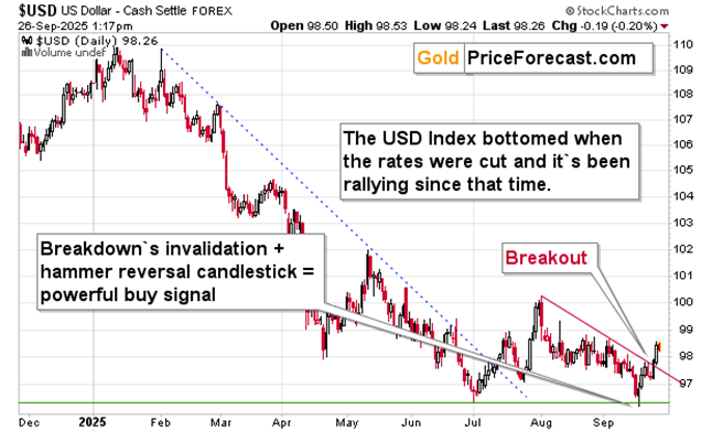 The USD Index pulled back a bit, but it’s still after a breakout and after a comeback above its April low. This is a very bullish combination – especially that the USD Index’s revival is taking place amid rate cut discussions and while Fed’s independence is being questioned. In other words, the USD Index is managing to rally despite everything being thrown at it.
