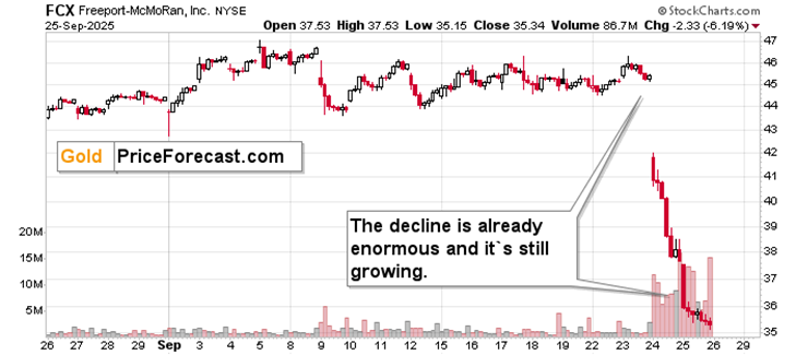 The enormous decline in FCX that I featured in Wednesday’s intraday Gold Trading Alert just got even bigger.