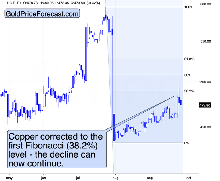 Why? Because copper seems to have completed its correction by rallying a bit above its 38.2% Fibonacci retracement and then failing to hold above this level.