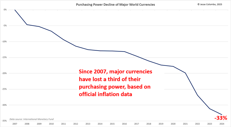 I calculated the average CPI for the major world currencies referenced throughout this report and found that, on average, they’ve lost 33% of their purchasing power since 2007. The resulting chart closely mirrors the gold-based purchasing power chart shown earlier, with the steepest declines occurring during two key periods: 2007 to 2012 and 2020 to 2024. Both of these were periods of heavy monetary expansion during recessions or crises.