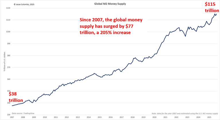 As the chart below illustrates, the global M2 money supply, one of the most widely used measures of total currency in circulation, has surged by 205% since 2007, rising from $38 trillion to a staggering $115 trillion. This massive expansion of the money supply is the driving force behind the soaring cost of living worldwide and a key reason why the price of gold has surged in every major currency across the globe.