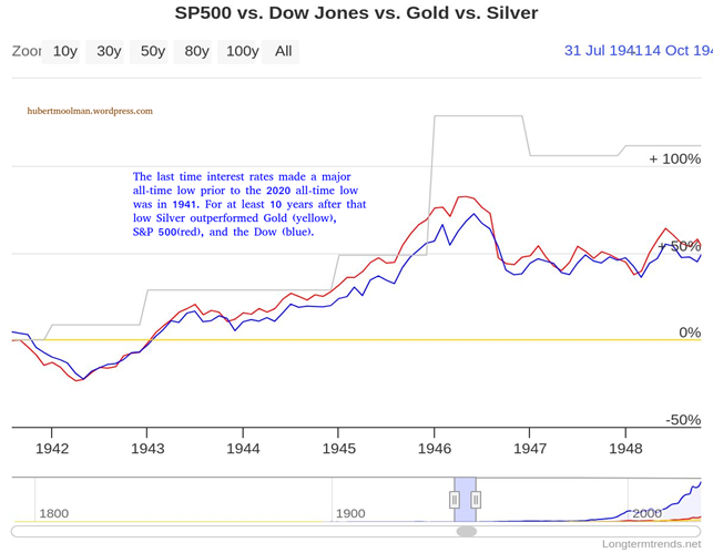 There have been a number of interest turnarounds, or interest rate bottoms, that prove that which is stated above. After the 1941 low in interest rates, silver outperformed gold and the stock market for at least a decade after:
