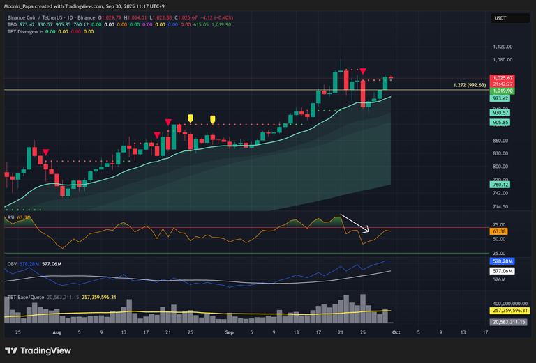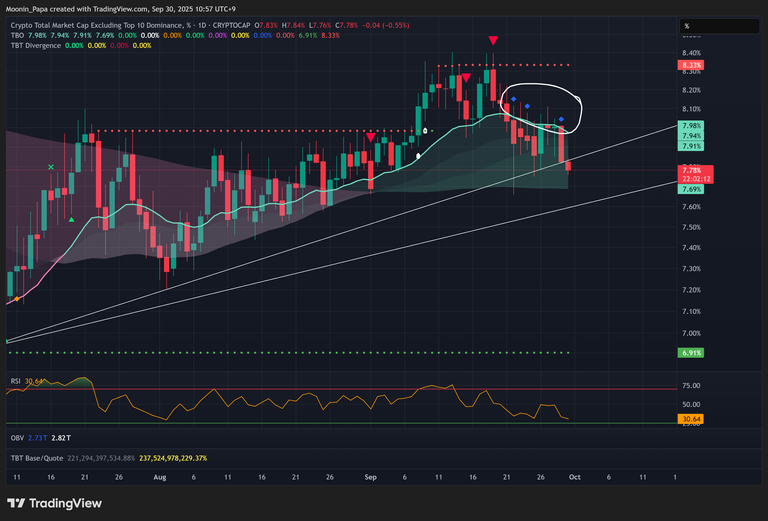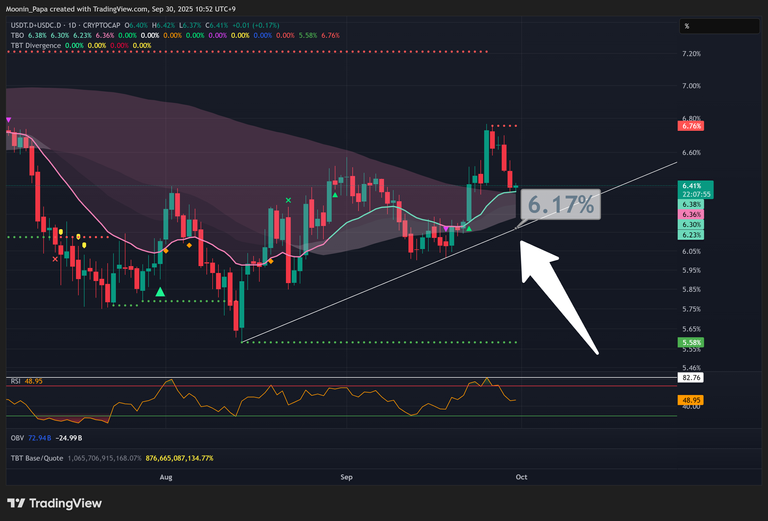 Ethereum remains in a bearish consolidation within the daily TBO Cloud, yet to challenge the fast line, with subdued volume and on-balance volume readings. In contrast, combined stablecoin dominance has declined to 6.40%, still held above the daily TBO Cloud. A drop below 6.17% would confirm a rotation into Bitcoin and select altcoins, a move anticipated once Bitcoin breaks the $115,700 level and advances toward $120,000.