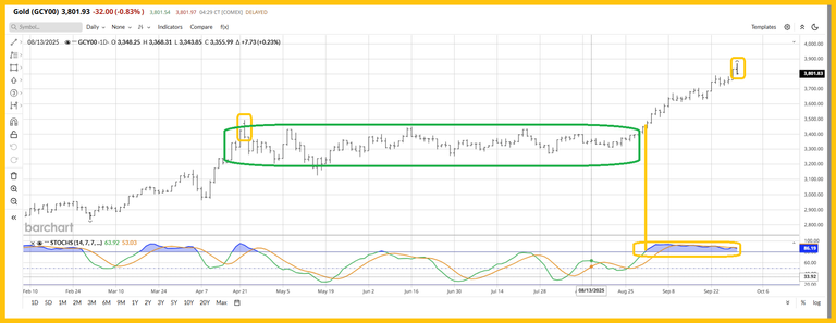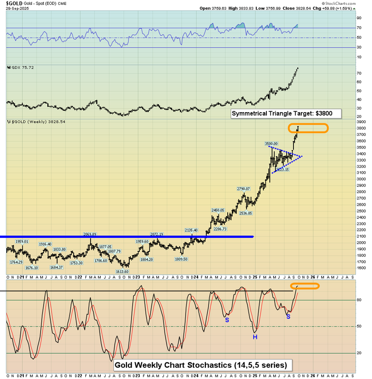 3. To begin to address these items. Double-click to enlarge this weekly gold chart. The beautiful triangle pattern’s $3800 target price has been acquired.