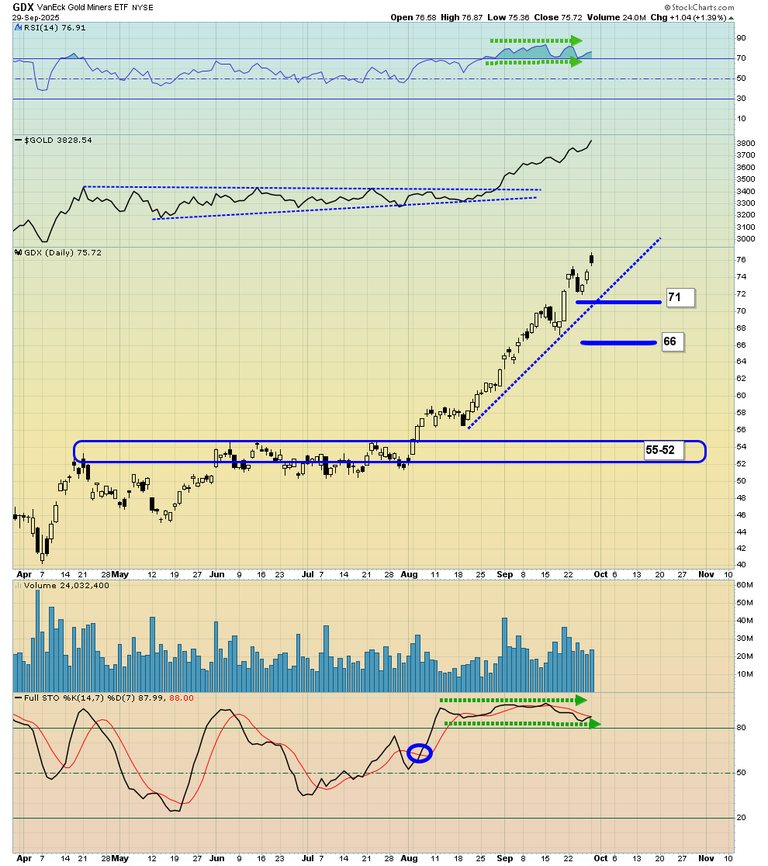 24. Double-click to enlarge this stunning GDX versus gold chart. The shutdown, Gaza peace, and October seasonality do coincide with the price arriving at the neckline zone of this spectacular inverse H&S pattern. A pause is expected, but it’s only a break in what should be decades of gold stock investor fun!
