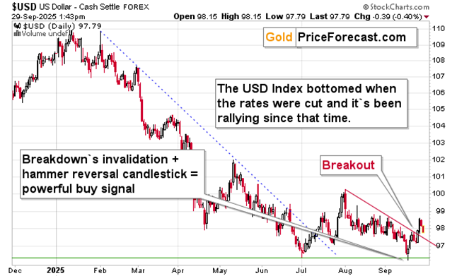 Let’s keep in mind that gold, silver, and miners used to decline only once the rally in the USD Index was clear. Right now, the USDX seems to be moving back and forth, even though its short- and medium-term breakouts are clear.