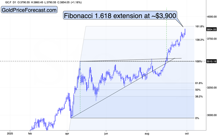 Gold rallied once again, and it’s now moving closer to the Fibonacci-extension-based target of $3,900.