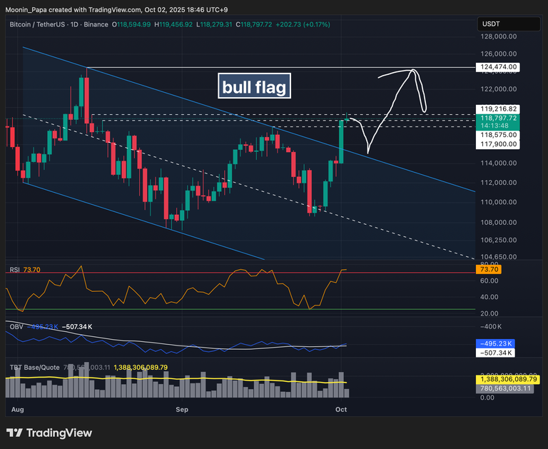 Bitcoin closed up nearly 4% yesterday, piercing three resistance fan lines within 12 hours and establishing a firm foothold above prior supply zones. Two scenarios now dominate: a pullback to retest the recently broken trendline—initiating a “bump and run” toward $124,000—or an uninterrupted advance to the same target. Key daily metrics show RSI perched above 70 (overbought), On-Balance Volume (OBV) back above its moving average, and trading volume exceeding its yellow moving average for a third consecutive day. Given the extension from the daily TBO Fast line and historical resistance near $120,000, a brief consolidation or minor retracement remains plausible before resuming higher.