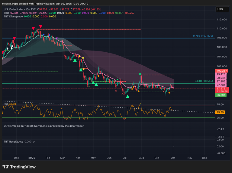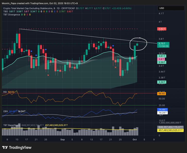 Combined stablecoin dominance fell 3.54%, closing below the daily TBO Cloud and breaching a short-term resistance line—an encouraging sign for crypto risk assets. A rebound off current support would likely correspond with a BTC pullback and downstream weakness in altcoins, whereas a continued decline in stablecoin share would signal sustained inflows into BTC and alts. Bitcoin dominance itself remains in bullish consolidation inside its daily TBO Cloud, poised to challenge the 61% level. On the weekly chart, the TBO Fast line at 60.35% represents the next hurdle for dominance gains.