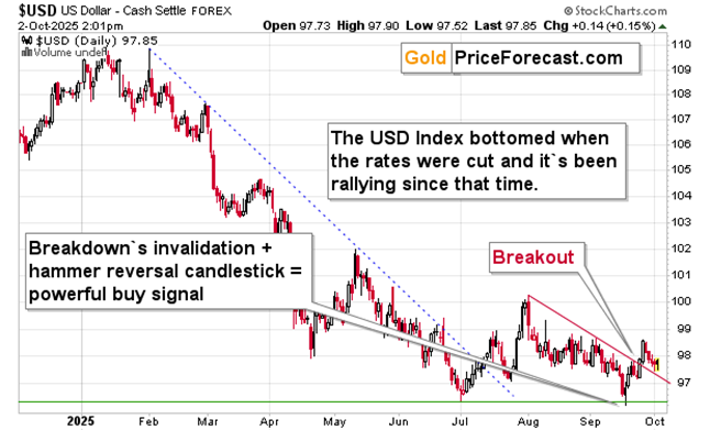 This perfectly fits the bullish reversal in the USD Index, and the fact that the latter survived even the U.S. gov’t shutdown. The universally hated and beaten down U.S. dollar refuses to fall further despite all that it’s thrown at it. This is exactly the kind of behavior that we see at major bottoms.