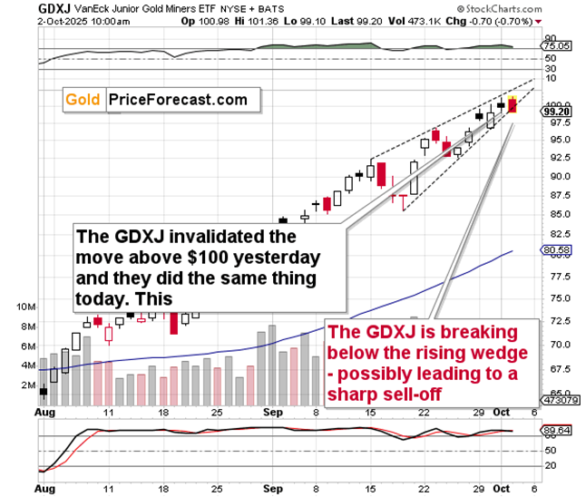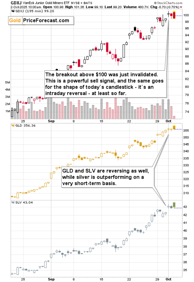 All of them reversed, and GDXJ even invalidated a small breakout above one of the roundest numbers possible – the $100 level. Both are sell signs. If GDXJ closes below $100 today (which seems likely), this powerful sell signal will be complete.